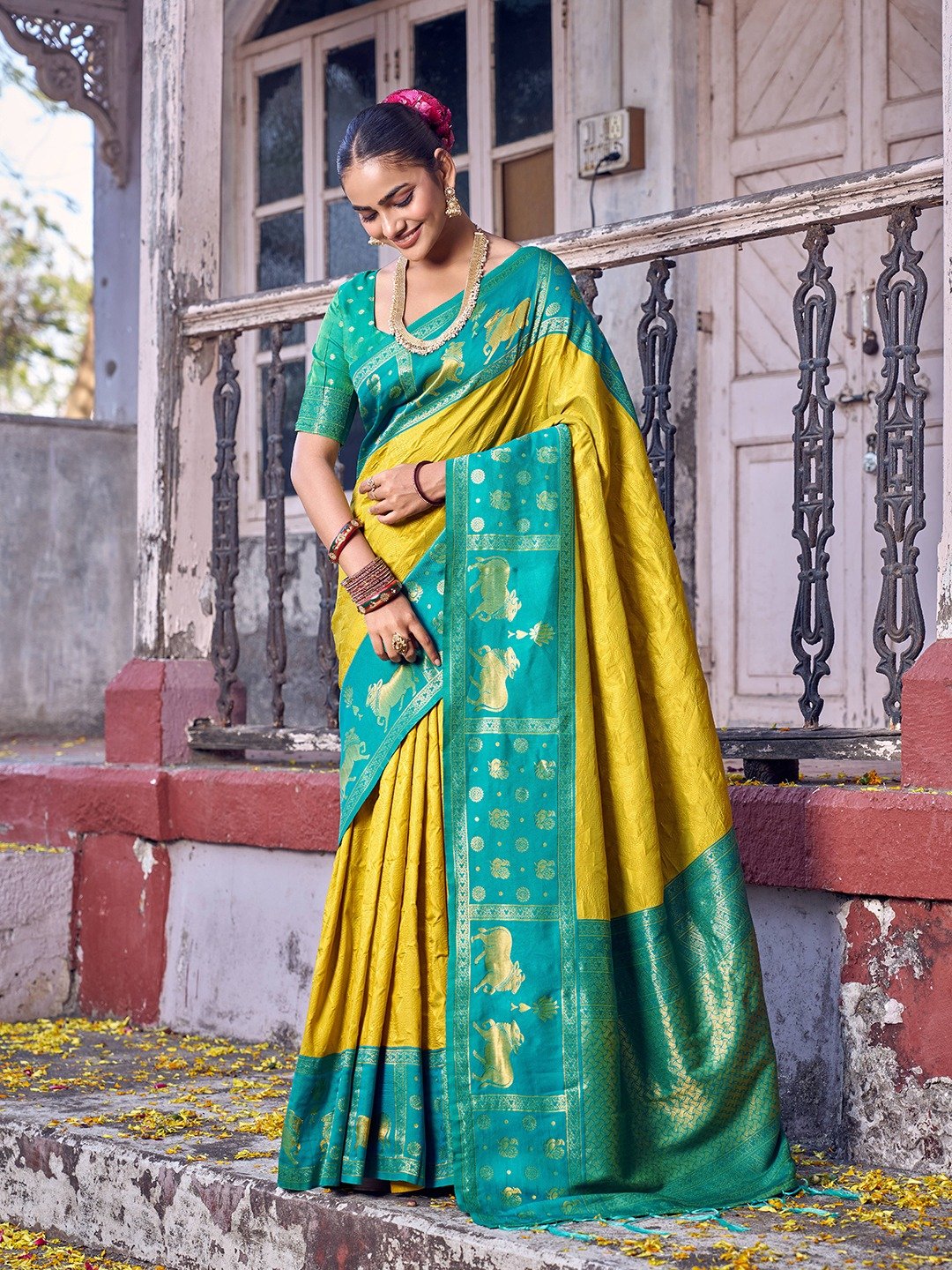 The Classic Look: Pair the attire with traditional gold temple jewelry and a sleek low bun adorned with fresh jasmine (Gajra).