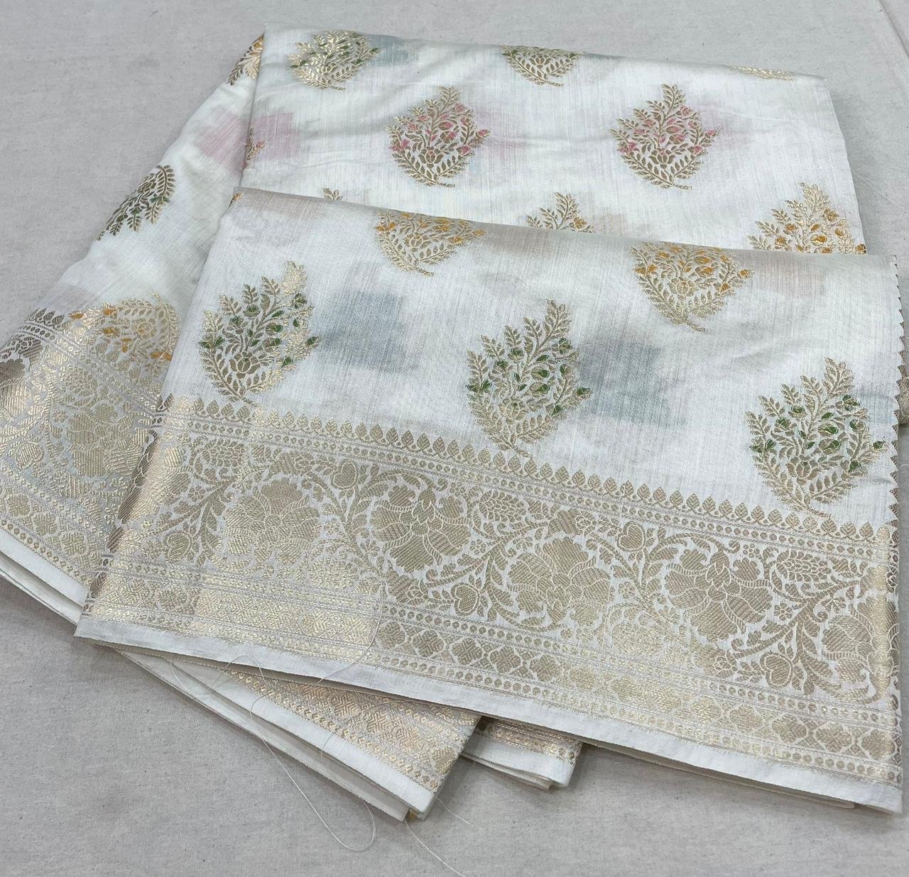 - Work: Traditional Banarasi weaving with detailed Meenakari