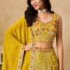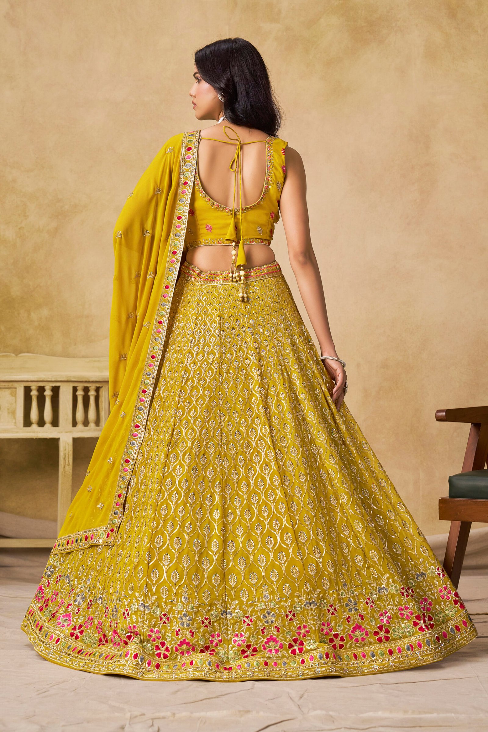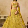 Bring home an aura of elegance with this stunning yellow lehenga choli set, crafted to perfection for weddings, festivities, and grand celebrations. The outfit features intricate mirror work, resham embroidery, and floral detailing, making it a true show-stopper.